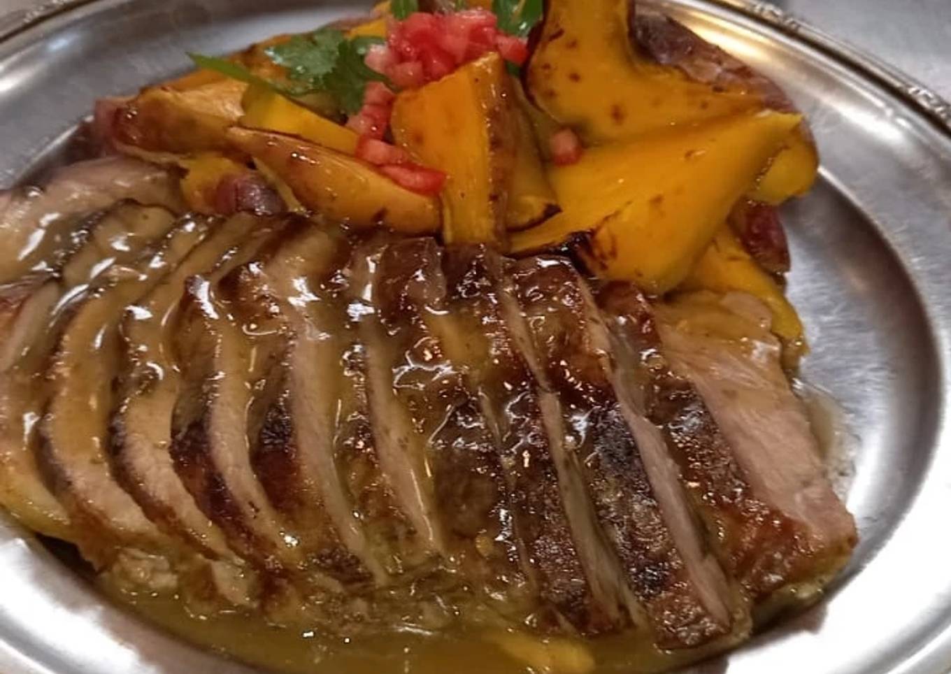 - Para las batatas hervimos enteras y luego con cáscara cortamos en gajos y con aceite y azúcar las caramelizados en horno bien fuerte. Ya con ambas preparaciones armamos nuestro plato.