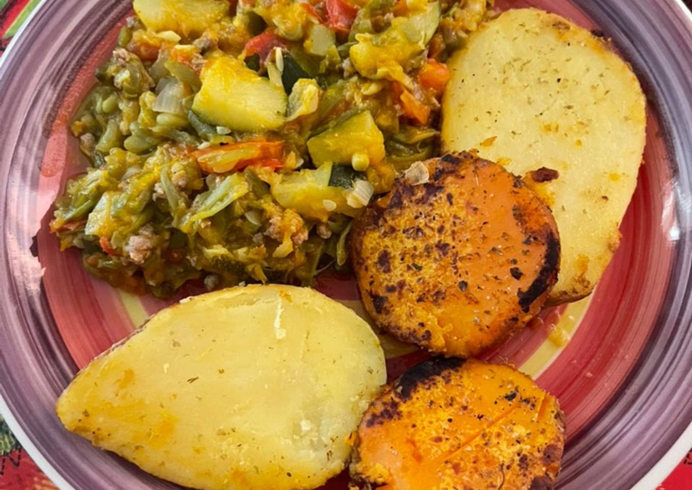 Guiso de porotos verdes y zapallos acompañado de papas y camote
