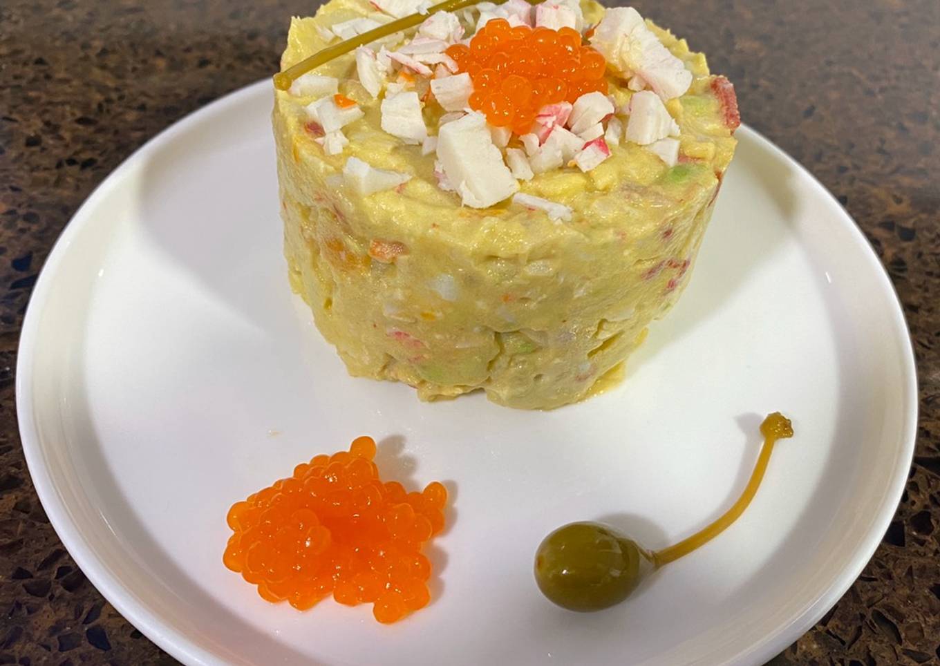 - Añadimos a la mezcla las patatas y la zanahoria, mezclamos suavemente incorporándolo todo y probamos para rectificar de sal y de Tabasco si así fuera necesario. También podemos rectificar de salsa rosa. Metemos en el frigorífico el bol con todo terminado y tapado con un film hasta la hora que vayamos a consumirlo. Para servirlo he usado un aro de presentación y lo he adornado con palitos de cangrejo desmenuzado, alcaparras y perlas de salmón. Muy rico!!!!