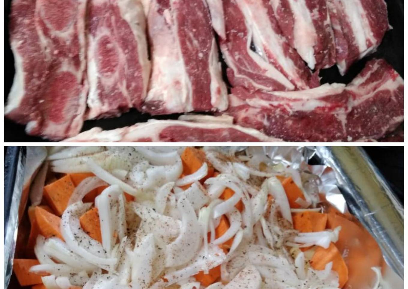 Instructions to make to make Falda con papas, batatas, y cebolla al horno..😋