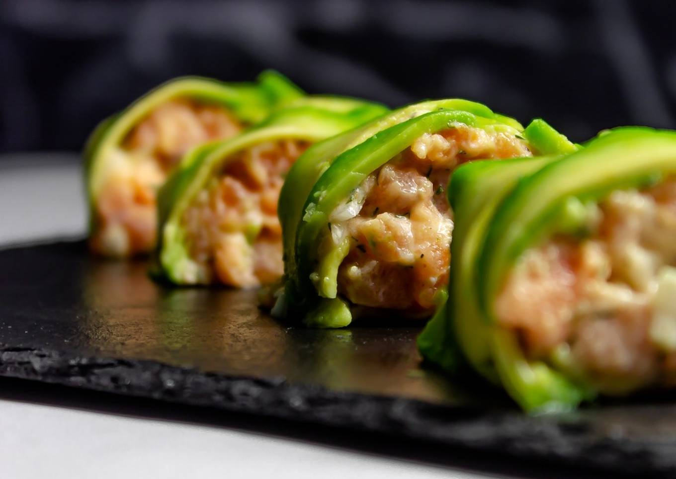 - Cubrimos el aguacate con el tartar de salmón en una capa uniforme y apretamos ligeramente para que después el rulo quede más prieto.
