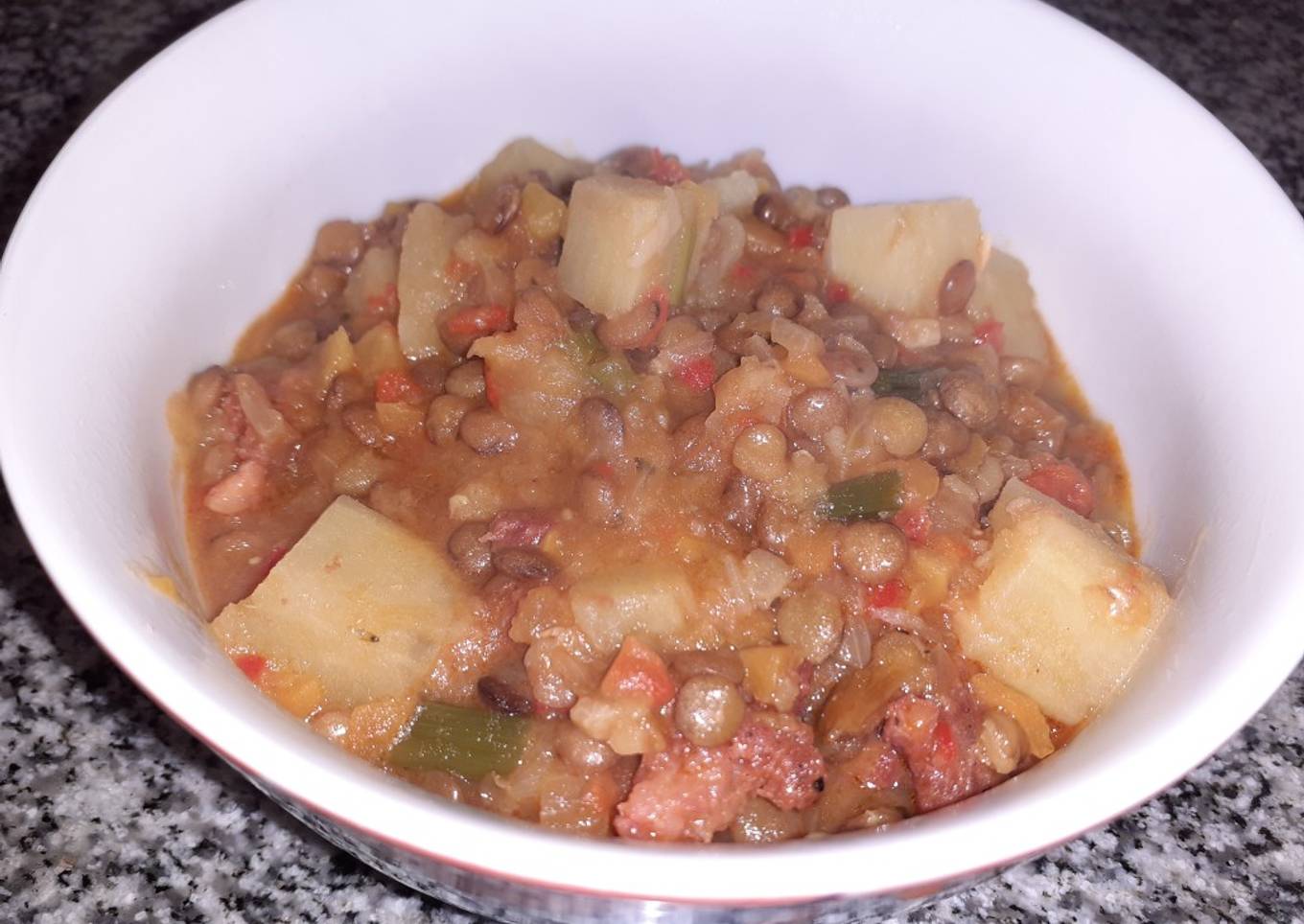 Hello everybody, I hope you're having an amazing day today. Today, I will show you a way to make a special dish, Guiso de lentejas con batatas. It is one of my favorites food recipes. This time, I'm gonna make it a bit tasty. This is gonna smell and look delicious.