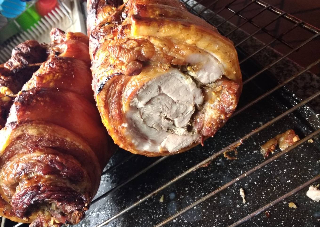 - Condimentar la porcheta, enrollarla y atarla. Se cocina en la parrilla muy lento, 3hs aprox. Para que quede bien crocante (ir girandola para que todo el cuerito quede crocante)