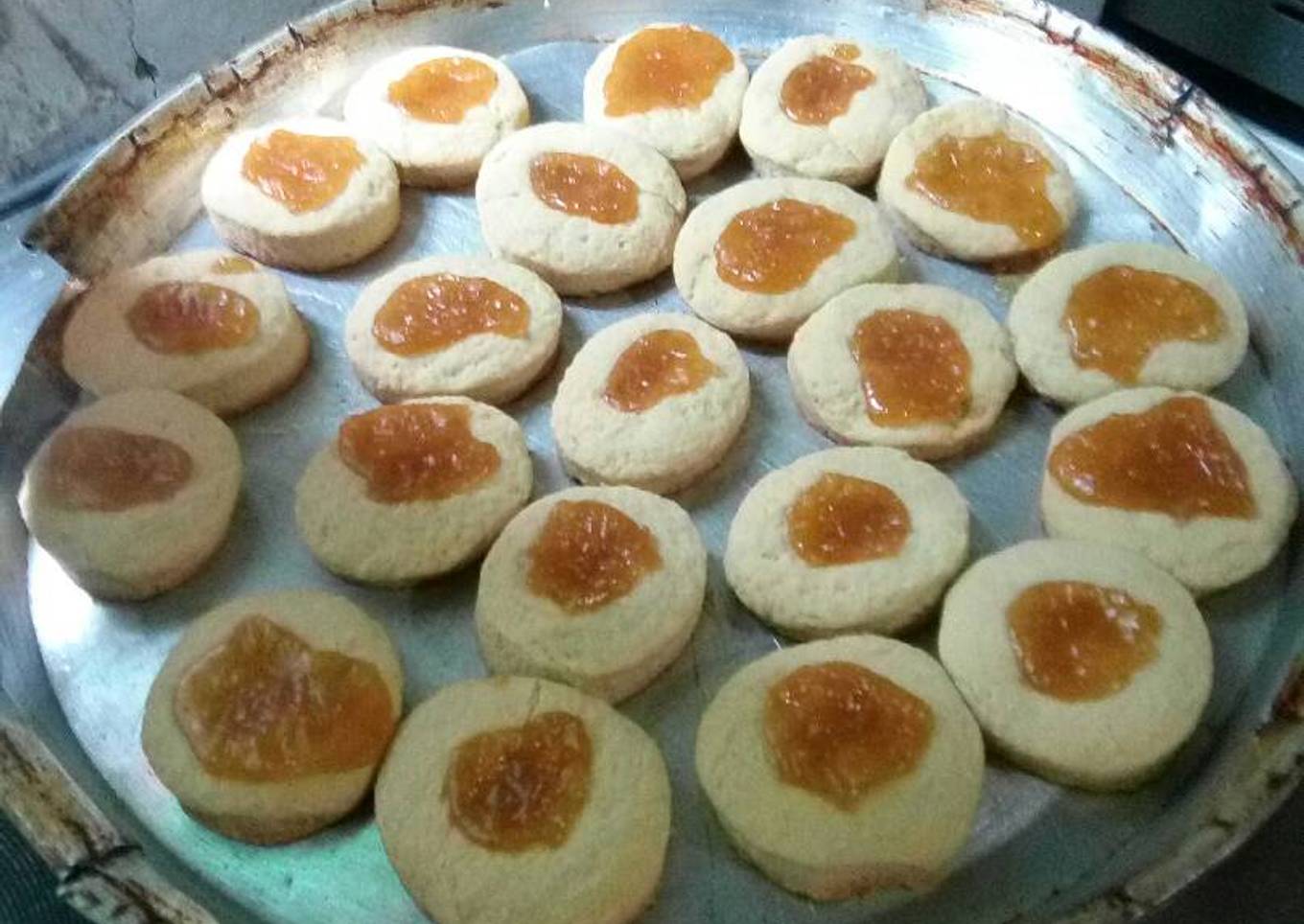 - Estirar la masa, con un cortador de masa dar forma a las galletitas, no muy finas, hacerles un hueco en el centro con el dedo e ir colocandoles el dulce