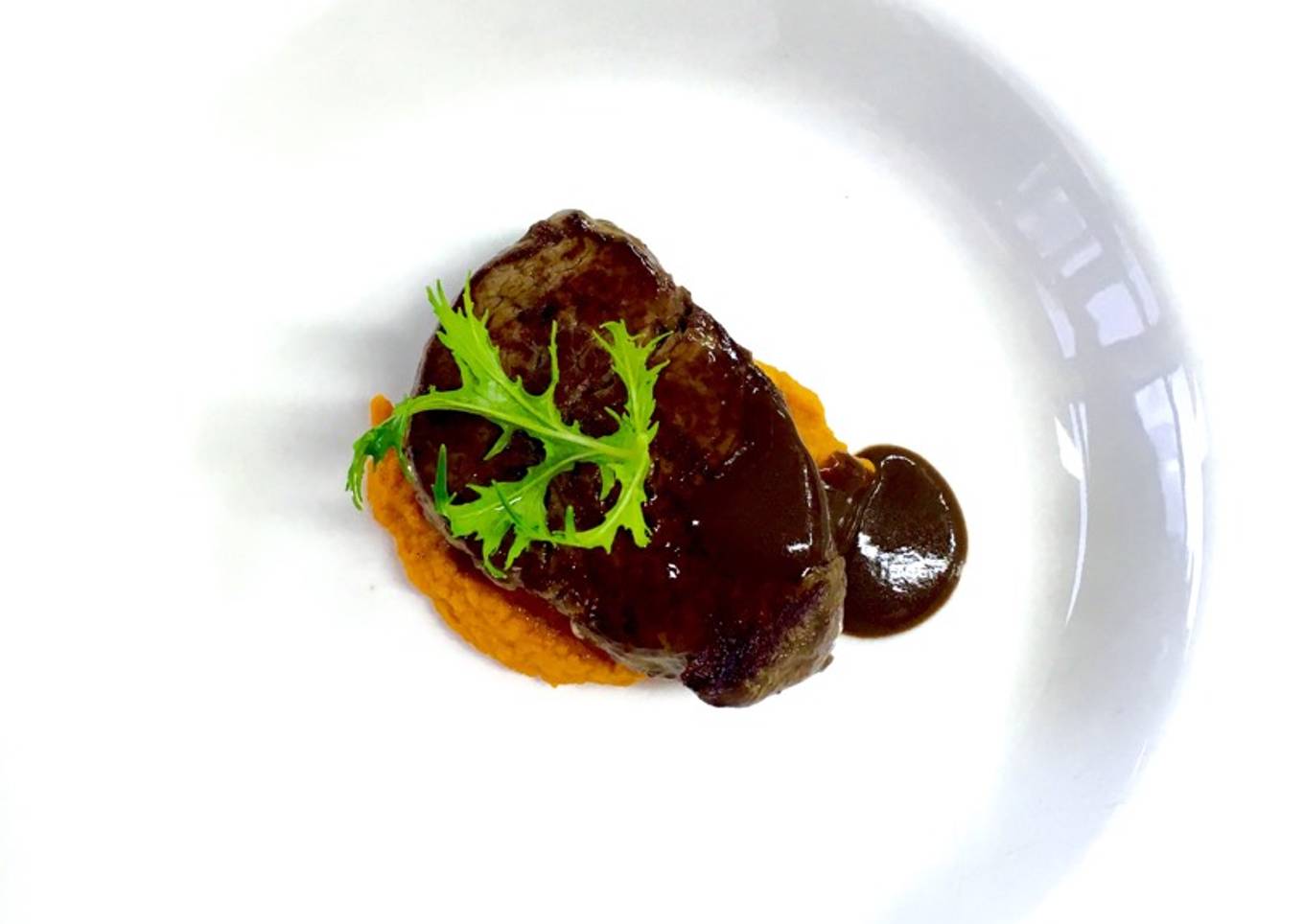 - Una vez lista la reducción de nuestra salsa está listo para emplatar con puré y nuestra carne en reserva.