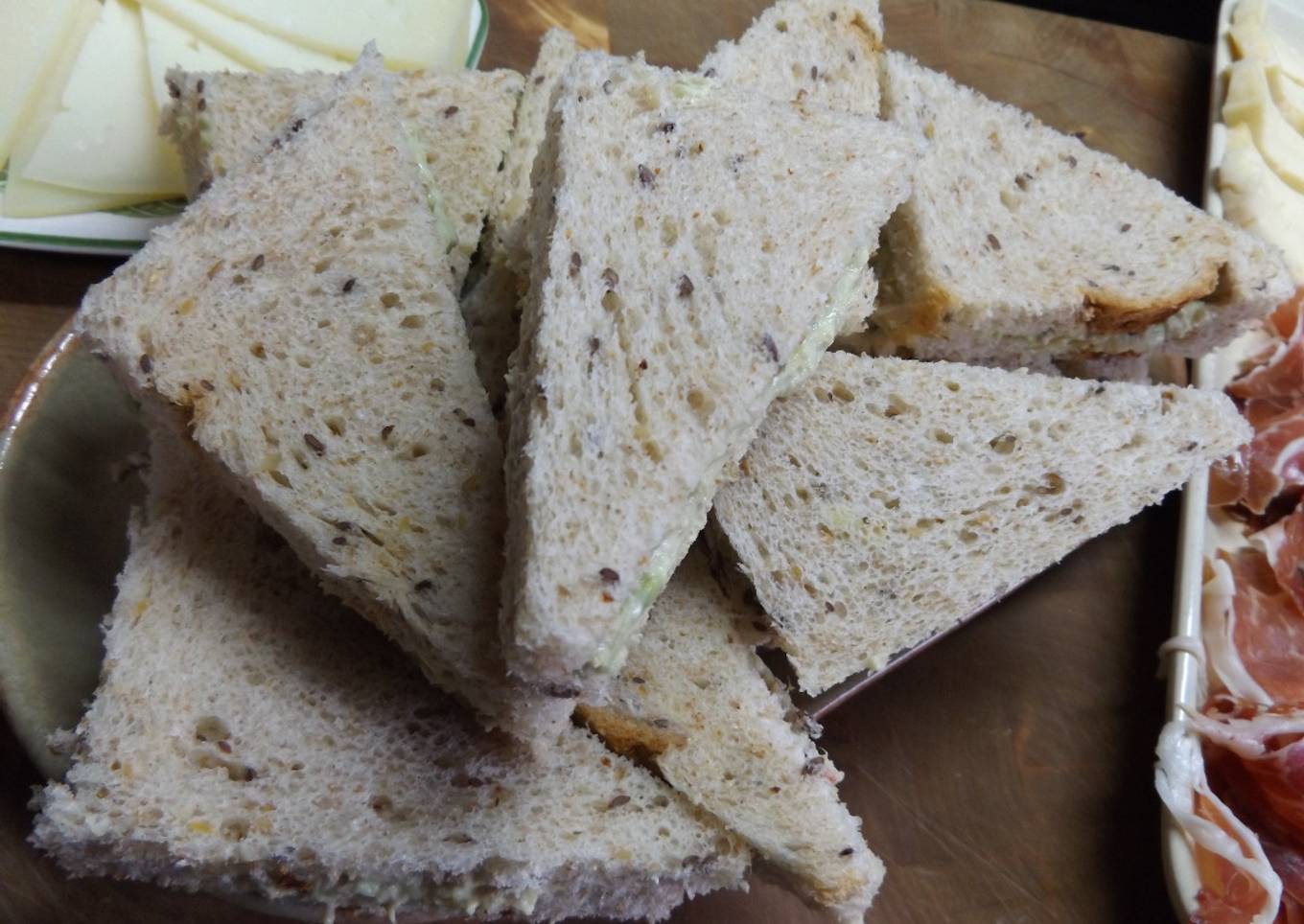 - Si el pan tiene bordes más duros es mejor quitarlos y dejar sólo la miga. De esa forma los sándwiches quedarán más tiernos y jugosos. Incorporar la mayonesa y la mostaza. Mezclar. Untar las rebanadas de pan por un lado y tapar con otra rebanada. Cortar por la mitad, en triángulo, cada sándwich. Si no se van a consumir en el momento tapar con un paño húmedo y guardar en la nevera.