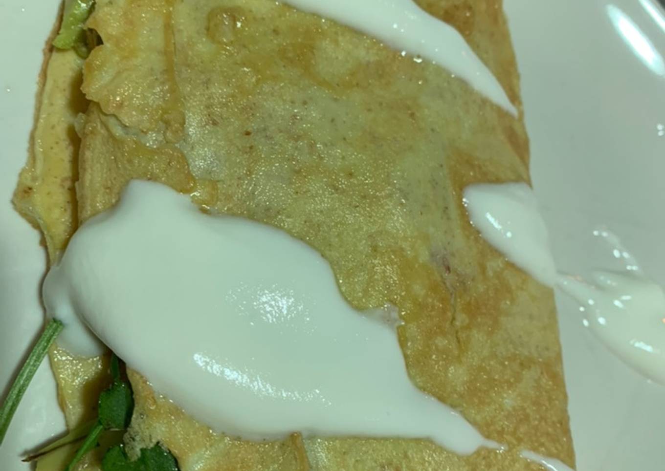 Tortilla media luna con tomate, aguacate, rúcula y queso. Topping de salsa de yogur